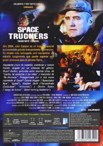 España Edition, PAL/Region 2 DVD: IDIOMAS: Español ( Mono ), Inglés ( Dolby Digital Stereo ), Español ( Subtitulos ), WIDESCREEN (2.35:1), EXTRAS: Acceso De la Escena, Anamorphic Widescreen, Menú Interactivo, SYNOPSIS: Año 2094. John Canyon es un viajero espacial que recorre la galaxia transportando mercancías. Su misión más arriesgada será transportar un extraño cargamento que puede suponer una grave amenaza para el planeta Tierra. …Transporte Espacial / Space Truckers